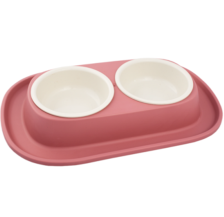 Dvigubas plastikinis dubenėlis guminiame stove, tinka katėms ir mažų veislių šunims.