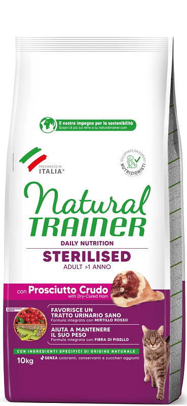 Trainer Natural Cat Adult visavertis pašaras sterilizuotoms suaugusioms katėms ir kastruotiems katinams nuo 1 metų amžiaus su vytintu kumpiu.