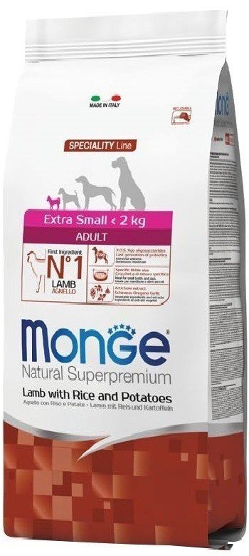 Monge Extra Small Adult Lamb with Rice and Patatoes sausas maistas šunims su ėriena, ryžiais ir bulvėmis. Skirtas itin mažų veislių suaugusiems šunims (<2kg). Be dažiklių ir konservantų.